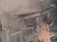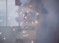 Explosions erupt inside a damaged warehouse. |