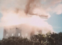 An oddly shaped building explodes. |