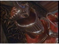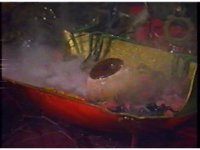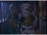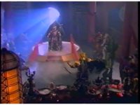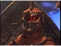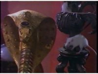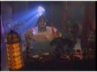 Close, slow pan up, as throne turns toward us, Lord Zedd sitting on it, raising his right hand, and gesturing his fingers menacingly. |