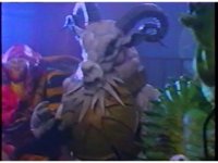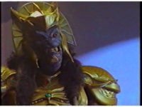 Continued nonconsecutively from two shots ago, Zedd is on balcony steps looking at Goldar talking, before shoving him back, then walking onto throne room floor, between Baboo & Squatt, shoving the former aside as he raises his right arm and heads up onto the throne. Zedd turns around toward us, as Squatt comes into frame. |