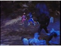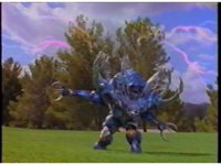 Three Rangers pose with Blades through to Black & Red retreating. Then from Black & Red facing Terror Toad with weapons through to pan up from Terror Toad's stomach showing Black's helmet. |