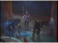Lightning crashes outside theater. Then from Rangers heading down stairs through to Snizzard & Robogoat following them in hall. Fade into six Rangers surrounded by bunch of singing monsters all the way through to Pink fighting Invenusable Flytrap. |