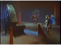 Goldar enters palace via balcony, then walks over and faces throne dias, as Squatt & Baboo hang out on rafters, shush each other, then teleport out. |