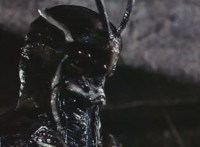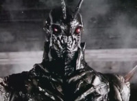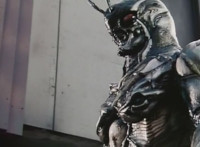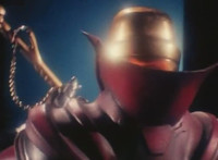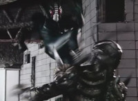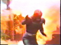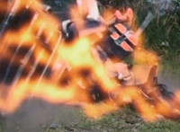 Masked Rider flies at Beetletron, who grabs him, clenches his large hands around his body, then flings him back into the air, where he drops onto his back. Beetletron fires at him, exploding a shack behind Masked Rider. |