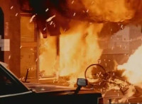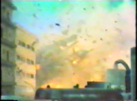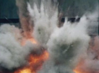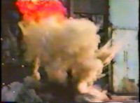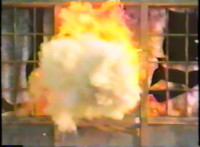 A warehouse explodes to pieces, leaving surrounding buildings untouched. |