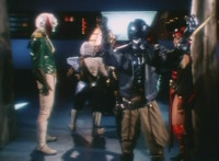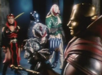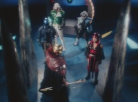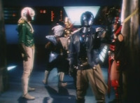 As the camera lowers into the bridge, Count Dregon and his four generals look upward, as Fact floats in, jerking arms while talking. |
