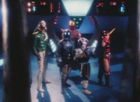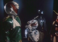 On Magno's viewscreen, we see Masked Rider & Beetletron struggle with one another. |