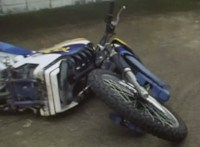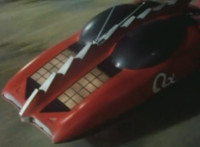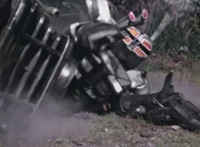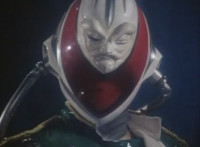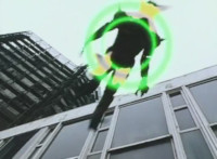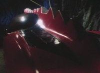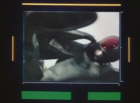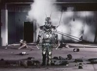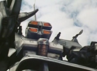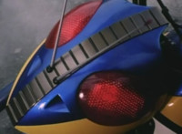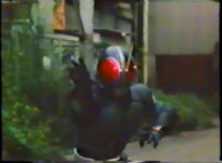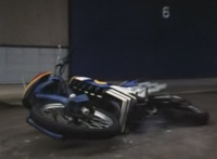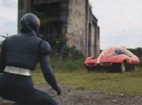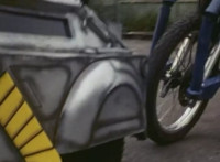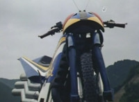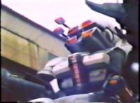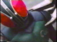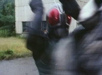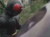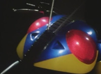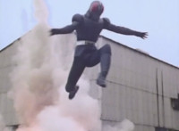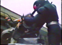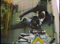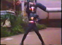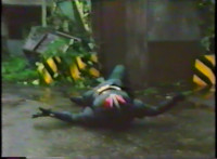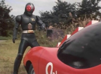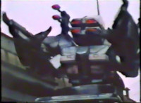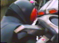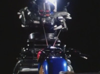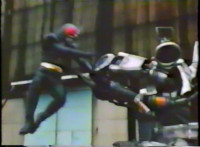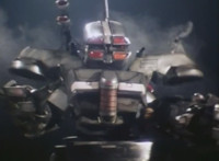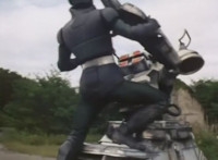 Cuts follow-up of Masked Rider falling off Beetletron. |