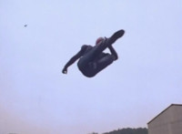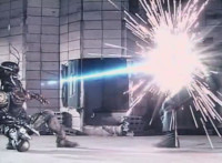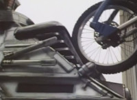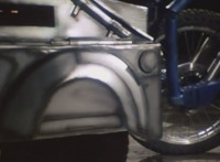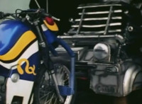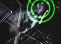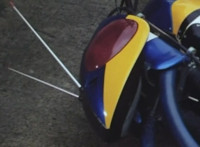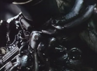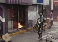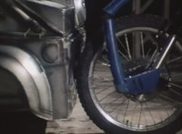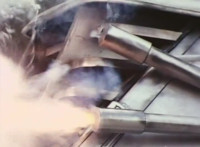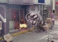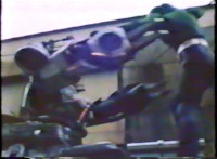 Trims start to remove Cyclopter driving by with his cycle; cuts follow-ups of Cyclopter blasting Chopper. |