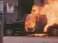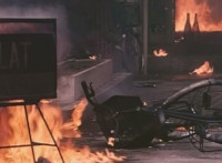 Blazing fires near a knocked down bicycle, and a flaming car. |