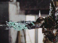 Destructasphere's right arms finishes being repaired, as he then holds it up in front of himself. |