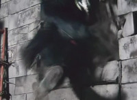 Masked Rider struggles on the ground as Destructasphere approaches through the hole in the wall. |