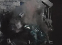 Masked Rider runs at Destructasphere, who laserblasts him sparkily, sending him smashing through a brick wall. |
