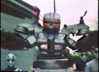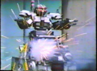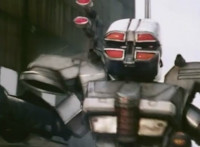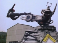 Masked Rider leaps up and jumpkicks into Beetletron, but misses and falls flat on his back, quickly recovering, only to get backhanded by Beetletron so hard he goes flying and rolling away. Beetletron then opens fire on him, as he leaps away from a dirt burst. |