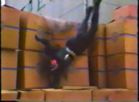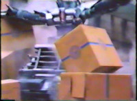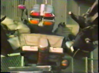 Masked Rider ceases standing there, changing his pose as he gestures down, then leaps forth, flipping over Beetletron and landing atop a high pipe. Beetletron fires his cannons up at him, bursting him back down, where he dives into him, getting thrown into a wall of cardboard boxes. Beetletron turns, then rolls through the boxes, only to stop, glance about, but finds no sign of his enemy. |