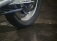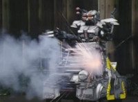 Combat Chopper's back wheel spins, as he's pushed out of the building by Beetletron. |