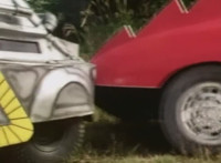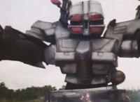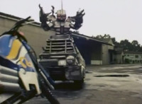 Beetletron drives through the grass, heading right at Masked Rider, grabbing him as he hops up onto his tank base, where they struggle for a bit. Magno approaches, driving right into Beetletron. |