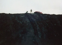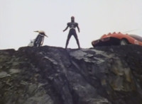 Zoom out from Masked Rider, still between his two vehicles on the edge of a cliff. |