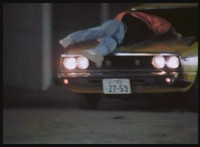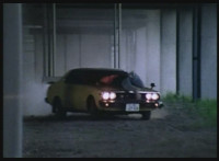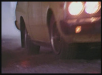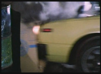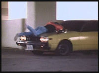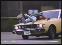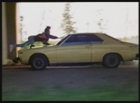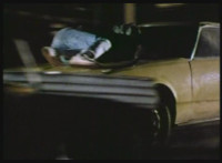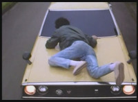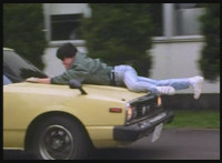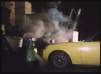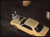 Side angle on Dex unwillingly riding the yellow car's hood. |