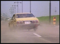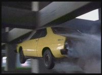 The yellow car does one of those Starsky & Hutch-style leaps. |