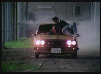 The yellow car rounds a corner with Dex on the hood, he punches at the windshield, to no avail, continuing to slide on the hood as it speeds onward. |