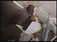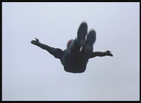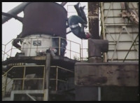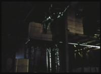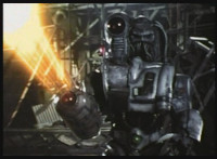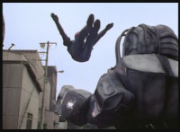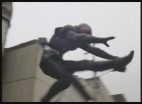 Mr Li fires his right hand cannon up at Dex, who dodges, causing the bursting of a hole in the ceiling of the warehouse. Dex falls off the catwalk, falling on his back as he's partially covered by falling debris. |