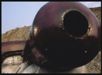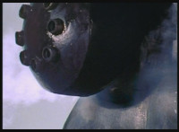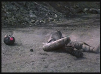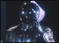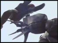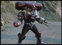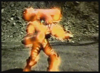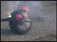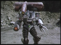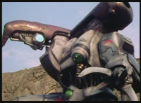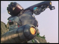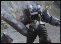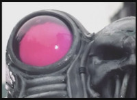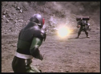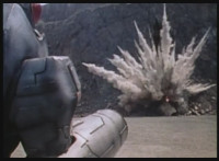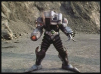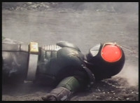 Larvatron lies decapitated, until his hand stirs, Masked Rider reacting, as his headless body stands up suddenly, and a new head rises up from within his neck! This three-sided head, with a single eye in the front, a gatling on one side and a cannon on the other, gets some close-ups, before Masked Rider poses defensively. Larvatron turns and fires his gatling face forth, smoke bursting Masked Rider, before turning and firing the cannon face, causing an explosion behind Masked Rider as he flips over it. Masked Rider lands, poses, then Larvatron fires his single eye forth, bursting the ground all around Masked Rider, until he suddenly floats into the air, passing over the explosions erutping all over the place, coming to a controlled landing in front of them. Larvatron fires his cannon arm, striking Masked Rider dead on, knocking him over and making an explosion erupt twice. |