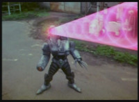 US replaces follow-ups of Masked Rider stabbing Larvatron, with firing a laser from his Electro Saber. |