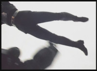 Cyclopter, holding his right arm forth, steps to the side while talking. |