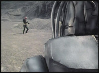 Various close-ups of Larvatron's body parts, steaming being released, as he stands ready. Masked Rider waits for him to approach, then he attacks, his blow shrugged off, before Larvatron proceeds to hit him a few times, until he's knocked into flipping up onto a nearby platform. Larvatron fires his cannon arm up at him, exploding the whole platform down, sending Masked Rider flying through a wall, ending up outside, where he hits a wall and falls down. Larvatron smashes his wall through the wall, then Masked Rider poses, before leaping up and flipping over him, bounding off his arm and flipping up onto a nearby roof. Larvatron scans him with his giant red eye, which next releases a beam of pink energy, bursting behind Masked Rider as he leaps back off the roof, throwing a punch at Larvatron, who blocks it and flips him over his head, sparkily slashing him for good measure. Masked Rider is flung into a quarry, landing perfectly, turning around to see Larvatron marching forth. Masked Rider poses, then paces to the side, while being scanning again. |