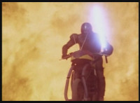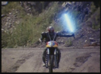 Combat Chopper drives onto the scene, Larvatron turns, Masked Rider flips over and lands on his cycle, driving him straight at the monster. Masked Rider gestures, then reaches down to his Ecto Accelerator, where his Electro Saber materializes, unsheathing it as it charges up and glow with power. Masked Rider holds his glowing Electro Saber forth, riding Combat Chopper through the quarry. Larvatron fires his eye and cannon arm forth, causing an explosion to erupt, then more behind Masked Rider as he leaps Combat Chopper into the air past them, then begins to leap off his cycle. |