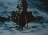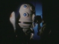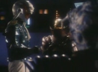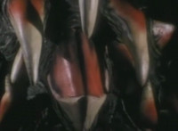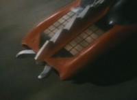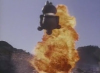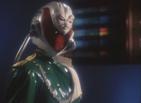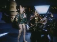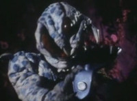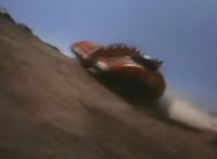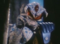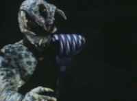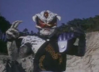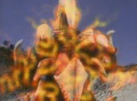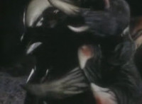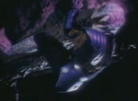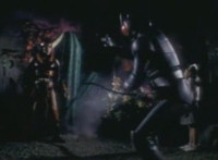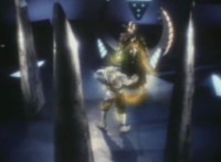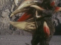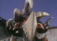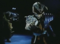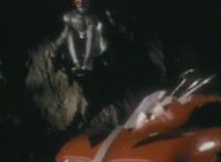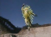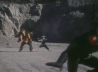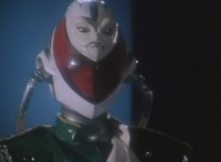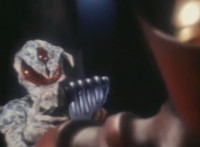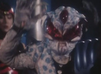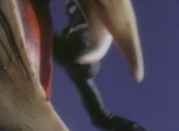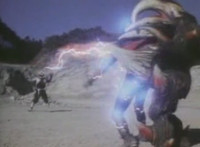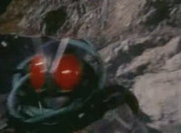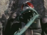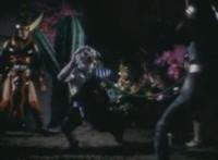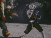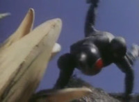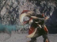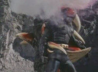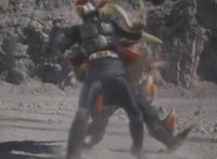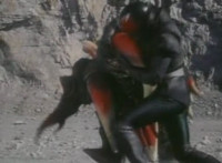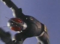 Masked Rider falls and rolls in front of Mandible, who then grabs him from behind, as Gork zaps a forehead beam at Masked Rider, bursting him, before Gork leaps up and teleports away. Masked Rider is agonized, before Mandible releases him and tries to tackle him with his spikey body, only for Masked Rider to grab his top spike, until he's flipped overhead and lands, poses. |