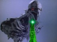 Spiderbase drops its jaws while firing a green energy beam downward. |