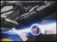 Recycled, per source; cuts follow-ups of Mandible firing more spikes, exploding behind MR, who then leaps in and stabs him, before sparking and exploding him. US replaces this with him firing a saber laser at him. |