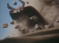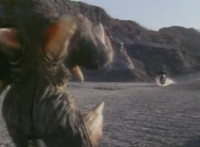 Magno drives off, as Masked Rider tangles with Mandible for a moment, before both leap upward, smash through the ceiling, cause the cave to explode, a dirt burst erupts in the quarry, then Masked Rider lands in the quarry, turning to face Mandible & Gork. Gork points and gestures. |