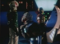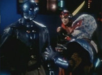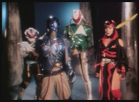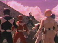 Masked Rider fights the Mighty Morphin Power Rangers. |