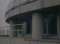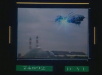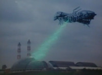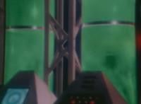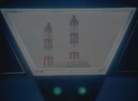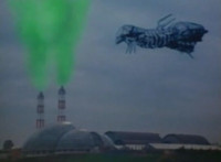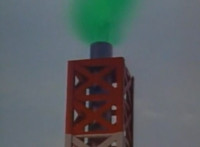 A quick shot of a pair of towers outside the factory as seen through the Spiderbase viewscreen, then the towers begin to spew green mist into the sky. |
