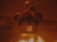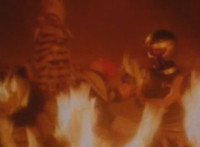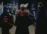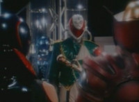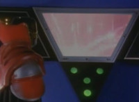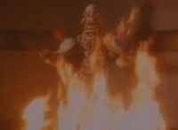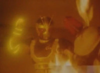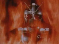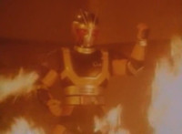 Suddenly, a fire breaks out in the room, distracting Masked Rider as Firebug proceeds to beat on him a bit, even grabbing him and holding him to the flames. Meanwhile, Count Dregon and his minions watch the fight on the Spiderbase viewscreen. Eventually, Masked Rider breaks free and throws a few kicks, and once Firebug backs off for a moment, he crosses his arms and summons his power-up. |