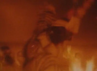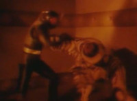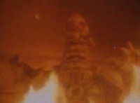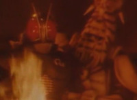 Firebug and Masked Rider fight for a bit, until the monster gets the upperhand, knocking him into the next room and sealing it off. Firebug approaches slowly and they resume fighting, Masked Rider soon kneeing him in the noggin. Firebug staggers back, then talks as he stands there, motioning arms as Masked Rider listens. |