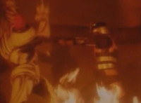 Super Gold grabs Firebug by the shoulder, turns him around, charges up his right fist, then punches him so hard he crackles and flies through a wall into the next room. He falls but recovers quickly, Super Gold walks through the flames unharmed, and once in the room, he stands before Firebug. |