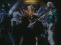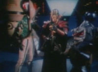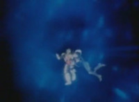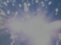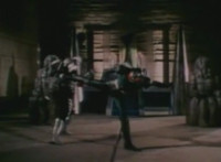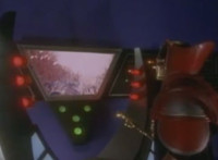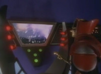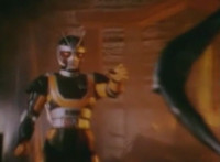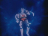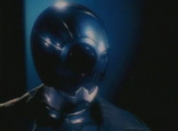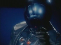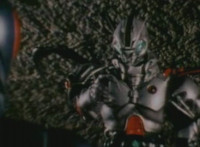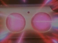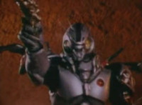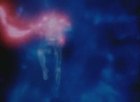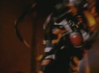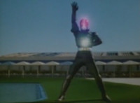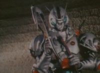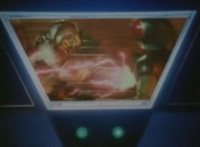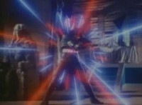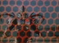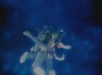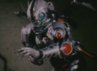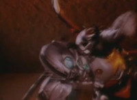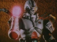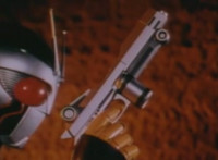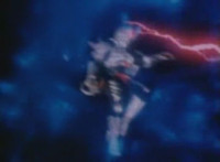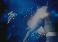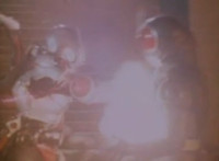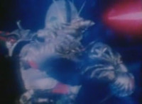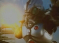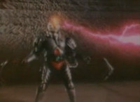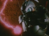 Robosect floats amid the vortex while talking, Masked Rider replies with an arm gesture, so Robosect fires a forehead bolt at him, bursting him so hard he flips over. Robosect then raises his laser pistol and fires into the vortex, causing an explosion in the fabric of the dimensional tunnel. |