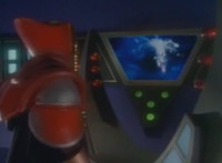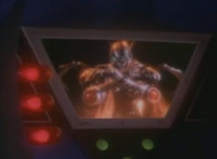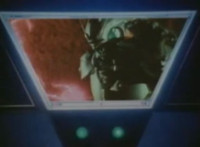 Robosect punches forth, bursting Masked Rider, as seen on the Spiderbase viewscreen. |