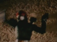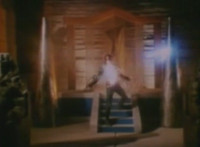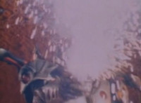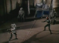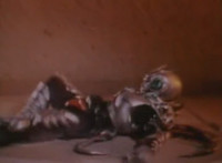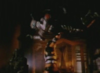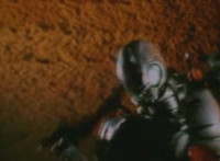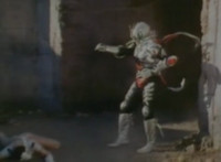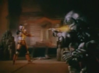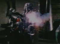 Trims start so you don't see the girl corpse on the ground (though it was visible earlier anyway); shot 4 is recycled but first in context; cuts follow-ups of Super Gold bringing corpse outside, then blasting Robosect's arm off before blasting him until he explodes. |