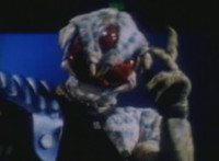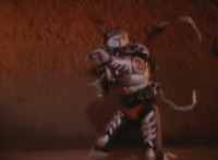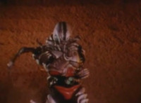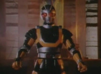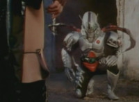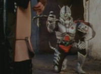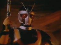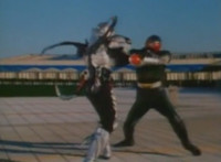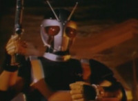 Robosect talks at Masked Rider while gesturing arms. Masked Rider, chest smoking, responds. Robosect charges up his right fist, then punches forth, bursting Masked Rider into falling over, though he quickly recovers, standing defensively. Robosect approaches slowly, giving Masked Rider a chance to activate his eye-senors, scanning the Insectivore and pinpointing his flashing left breast button. Masked Rider backs up as Robosect approaches, then slaps him down, but he quickly gets back up and they lock arms, switching positions until Masked Rider strikes his arm free, and grasps at his chest button. The red orb glows. |