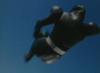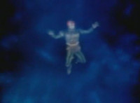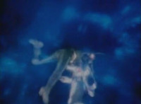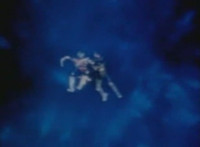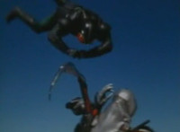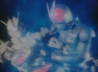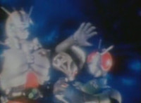 Robosect & Masked Rider continue their struggle as they slip into the wormhole further and further. Masked Rider, gripping Robosect's left arm and shoulder, exchanges some dialogue with him, before elbowing him. They spin around as they continue to fly through the vortex, the pair remaining in contact the whole time. |