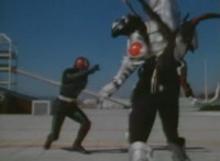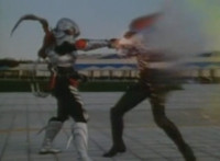Masked Rider poses, crouches, then springs into a leap, bounding at Robosect, both deflecting each other with punches. Masked Rider flips over, then throws a kick, which Robosect blocks, before blocking his next punch, grabbing his arm, and socking him in the gut. Robosect talks at Masked Rider, before flipping him over. He rolls, but recovers and poses. |