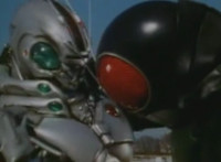 Robosect reacts, Masked Rider poses at ease. |
