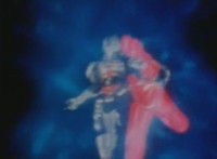 Robosect reacts, Masked Rider responds, as the pair begin to glow red. They're immediately pulled into a bluish hyperspace, where they struggle in one another's embrace. |