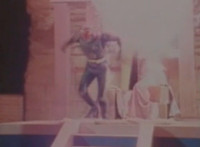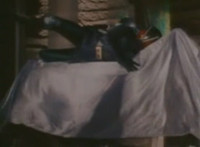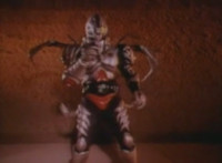 Robosect approaches and slashes at Masked Rider with both pincher blades, sending him flying up into the air, and down on a sheet-covered altar. Robosect fires a forehead bolt forth, bursting behind Masked Rider as he dives off the altar, rolls, and poses. |