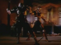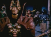Robosect talks, points, and poses. Masked Rider turns and reacts, as the entrance seals shut. Both react, then pace about the room. |